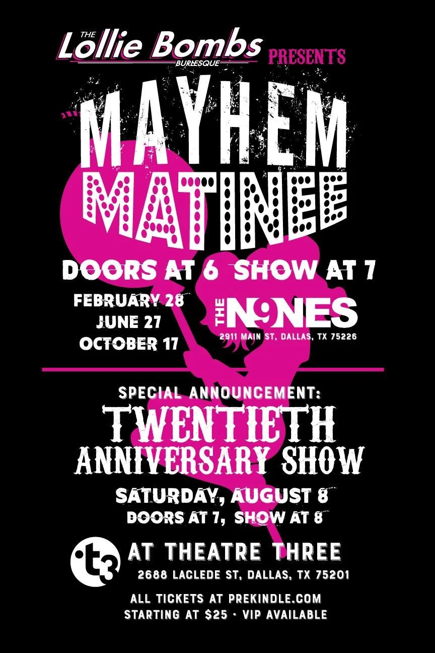 Lollie Bombs Burlesque is North Texas' most electrifying neo-burlesque troupe, run by none other than the fierce Miss Malicious! Known as the "Dastardly Darlings of Burlesque," they’ve been shaking up the Dallas scene since 2006. These performers (and their Bomb Squad crew) don’t just perform—they explode onto the stage with a wild mix of trapeze, silks, lyra, hula, sideshow stunts, live singing, clowns, magic, and pure chaos. They’ve even turned cult favorites like The Fifth Element, Buffy the Vampire Slayer, and The Big Lebowski into live-action burlesque spectacles. There’s no emcee here—just non-stop sound bites, raffles, and crowd games that keep you on your toes. Want to take their wild energy to your own event? You can book them and turn the party up to 11. Follow Lollie Bombs on social media for tickets, booking info, and to see what they will do next!